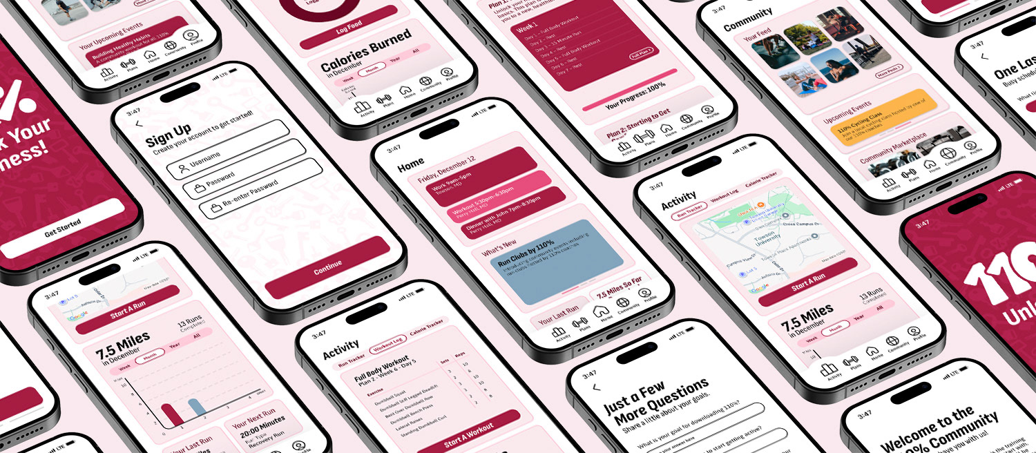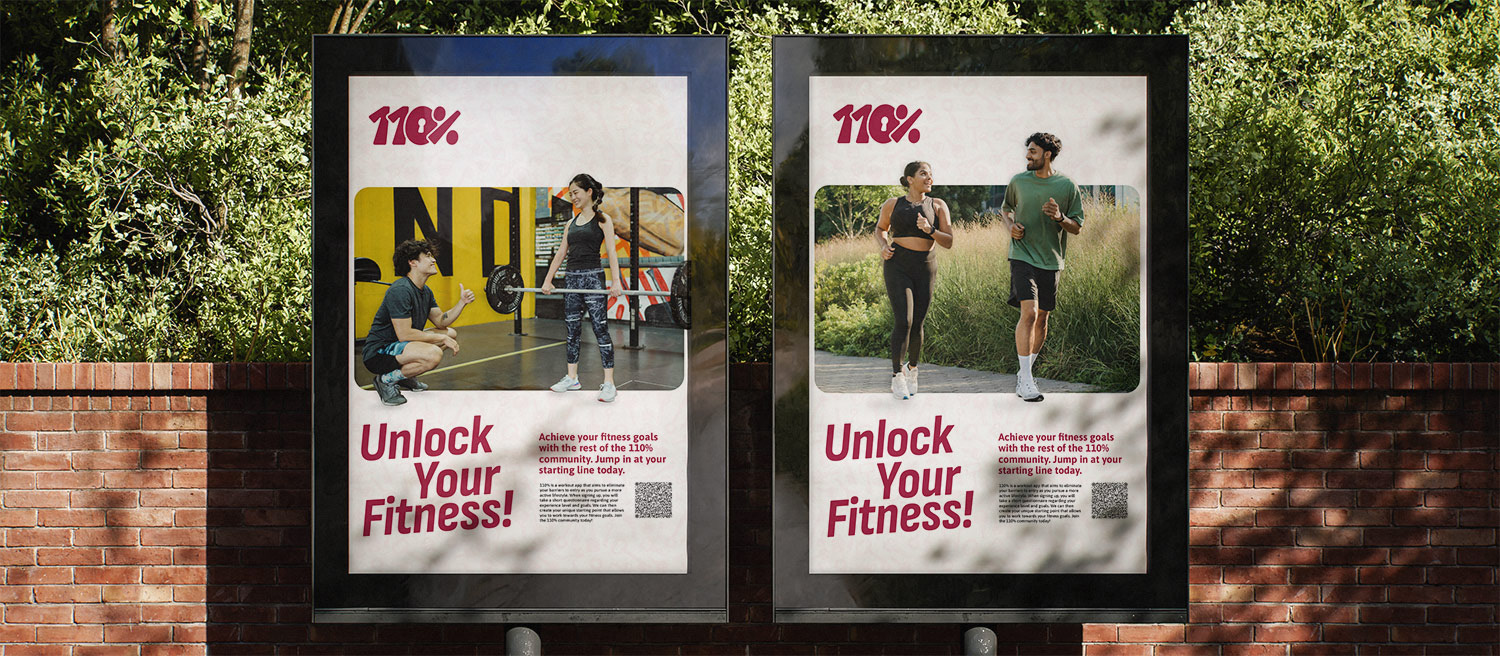To advertise the app, this set of posters promotes the tagline of 110% which is "Unlock Fitness". These posters additionally serve a way for potential users to visualize themself joining the community that 110% aims to build.