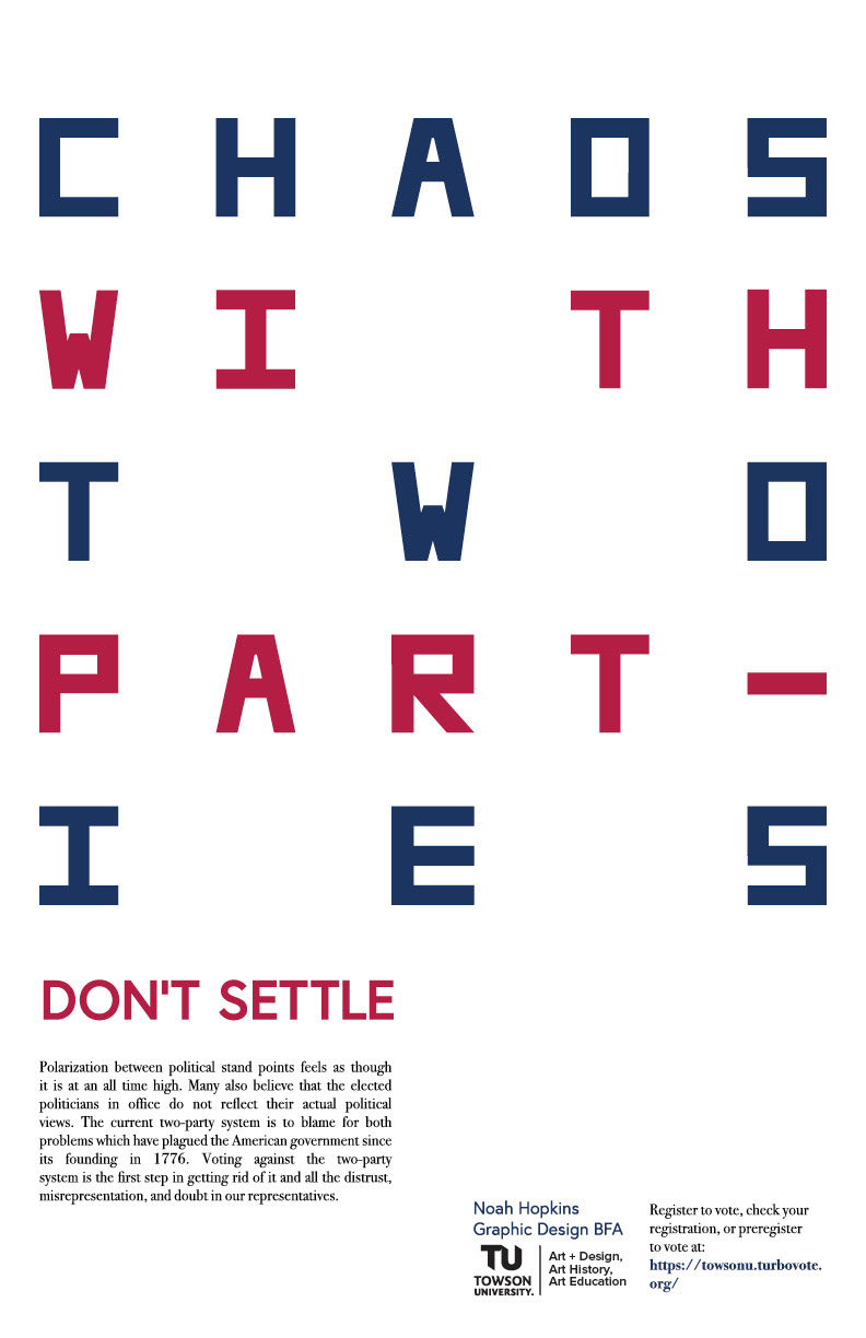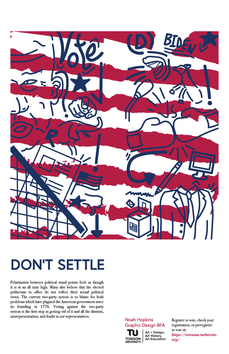 These posters were created with the purpose of getting people out to the polls for the 2024 elections. This set found inspiration in the political separation of today's society in order to promote the mentality of not settling for a candidate but rather supporting someone you truly believe in.